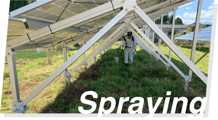 ソーラーパネル下などの設備機器付近は、手作業による除草剤散布で丁寧に対応。